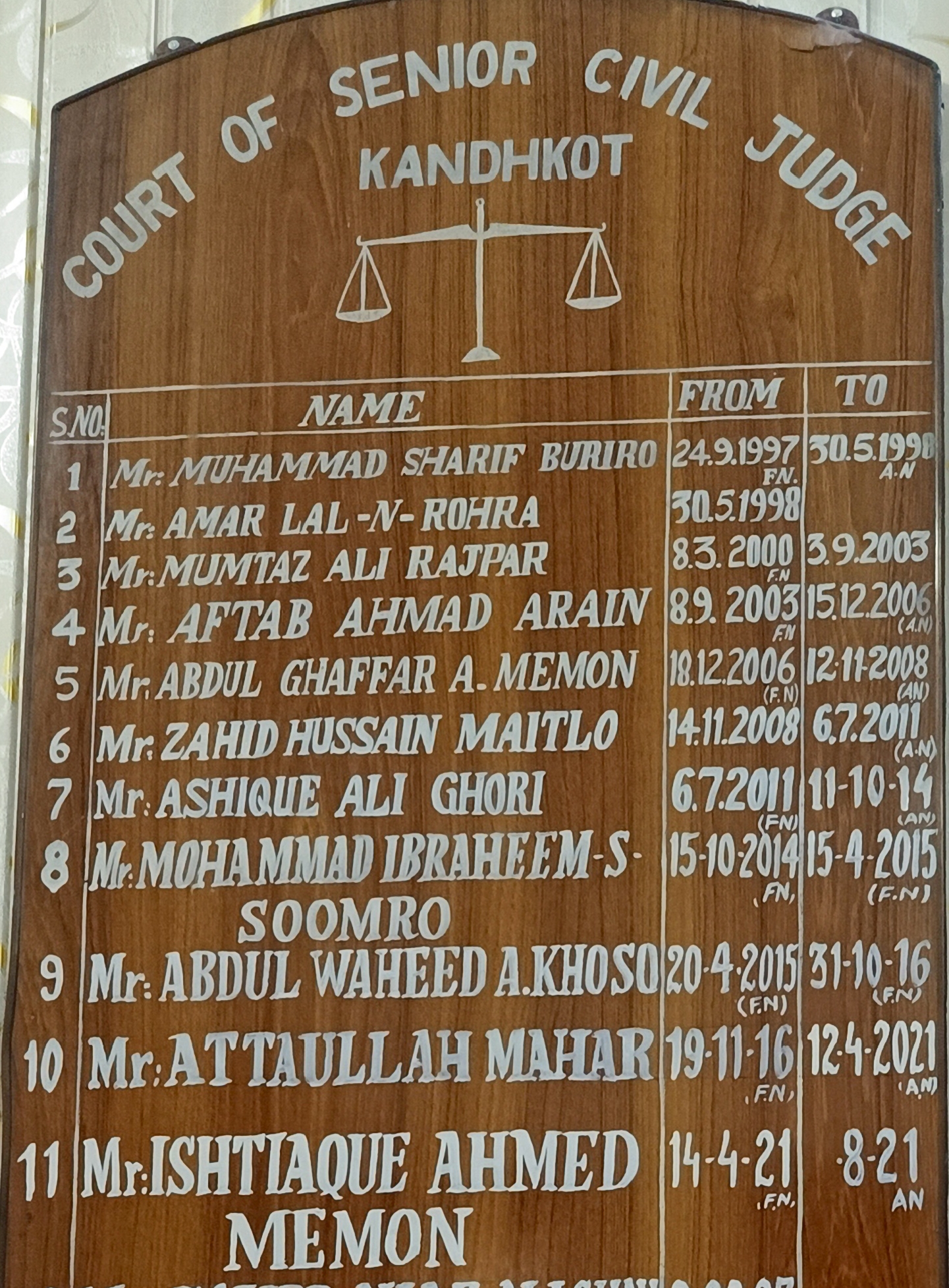 Honourable Senior Civil Judge / Assistant Sessions Judge, Posted at Senior Civil Judge / Assistant Sessions Court, Kandhkot from 1975.